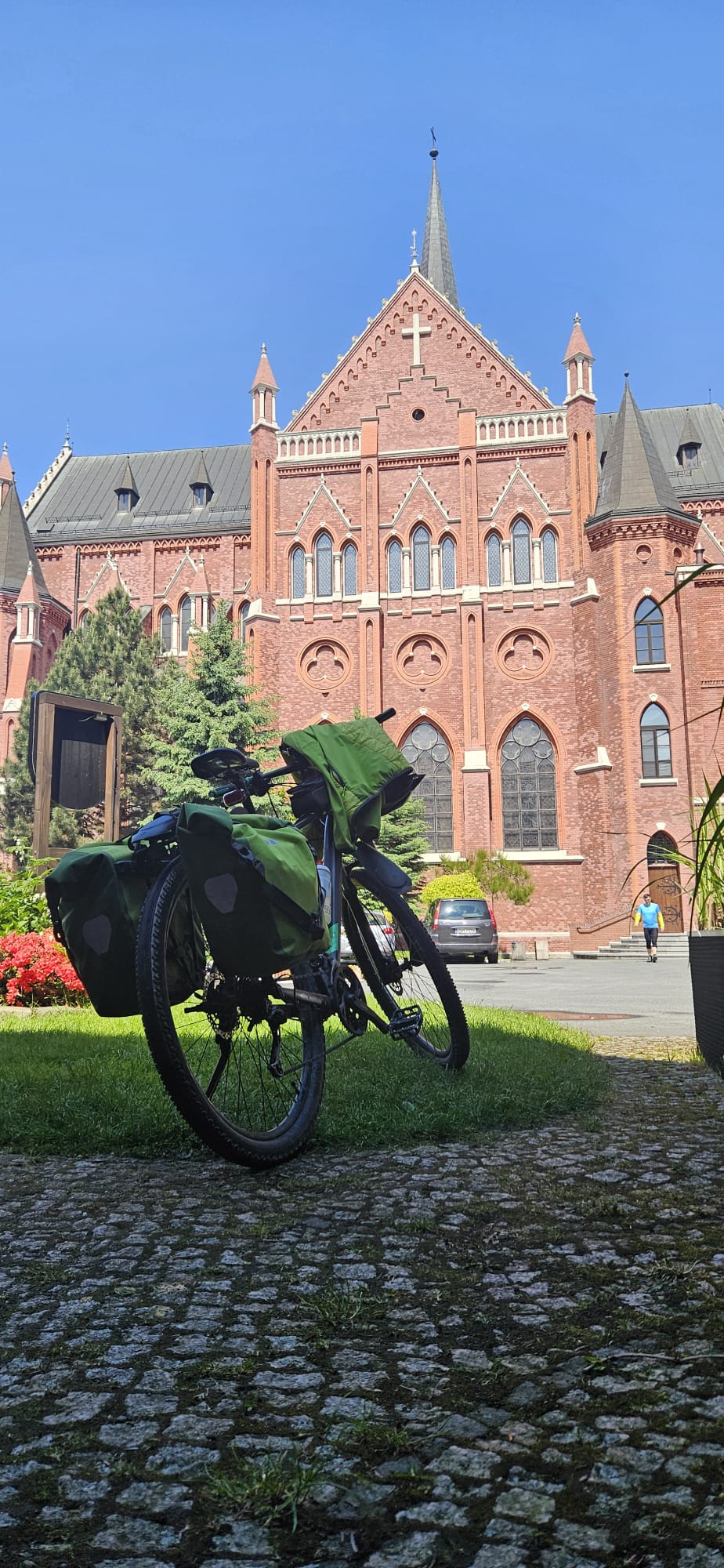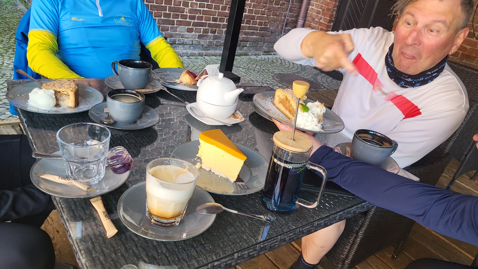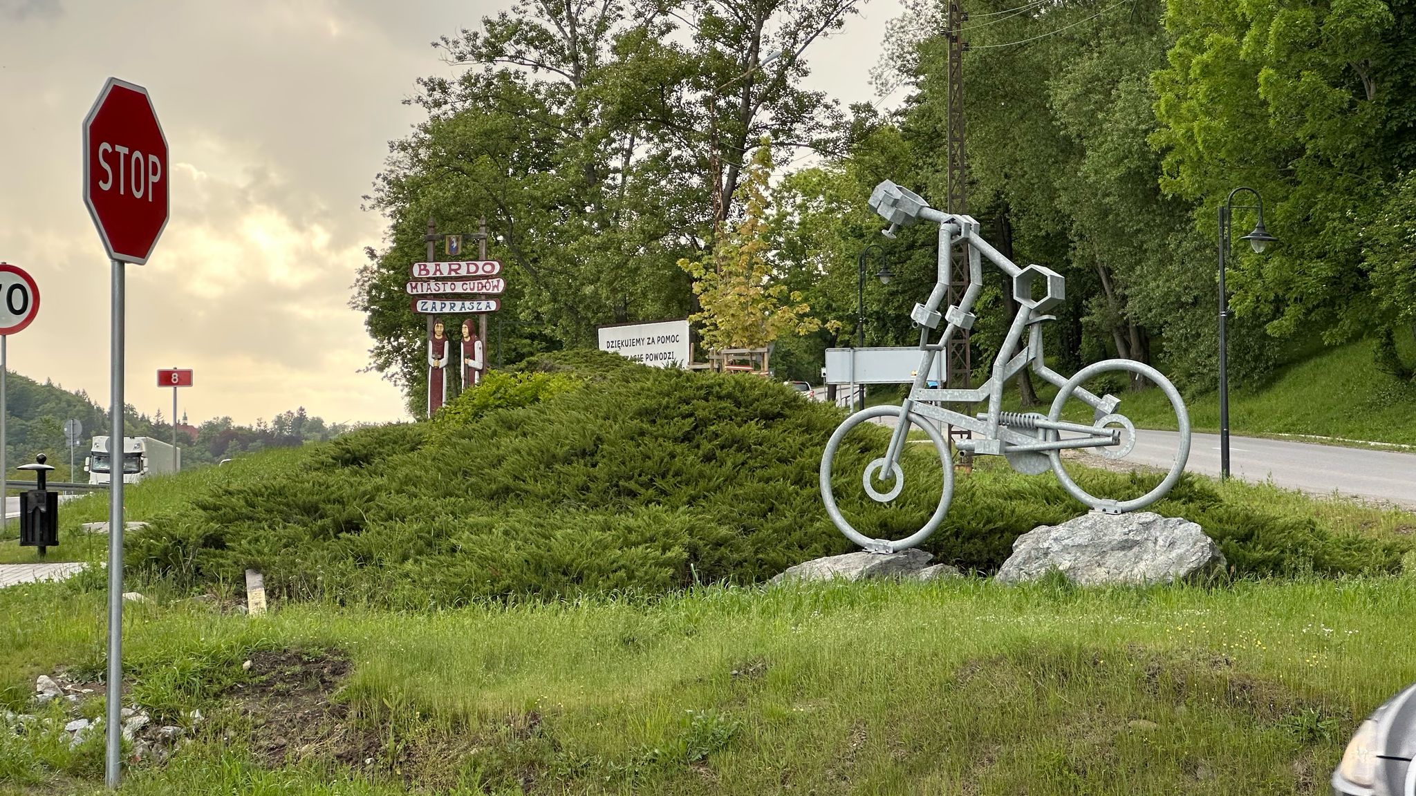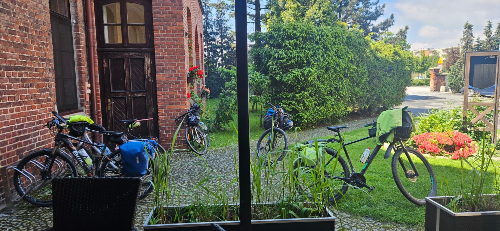 o szybkiej naprawie dętki (ale tej w rowerze, bo my sami już jak dętki...) ruszyliśmy dalej. Pierwszy raz od startu powitało nas piękne słońce i nawet w trakcie jazdy pozbywaliśmy się wierzchnich warstw niczym powabne pracownice klubów w Amsterdamie (tzn. tak nam koledzy opowiadali, że tak tam jest). Korzystając z bezsprzecznych zdolności nawigacyjnych Krzysztofa, prawie wcale nie jechaliśmy po asfalcie, co nie było planowane... No, ale możemy śmiało uznać, że odcinek szutrowy podczas tegorocznego touru zaliczyliśmy śpiewająco. Śpiewami żałobnymi, ale zawsze... Ta podniosła atmosfera doholowała nas aż do Kawałka Nieba, czyli sympatycznej kawiarenki parafialnej w Nysie, gdzie z sercem przyjęto strudzonych kolarzy. Odwiedziliśmy też Paczków, a w nim winnicę i Muzeum motoryzacji. Niestety, nie pamiętamy, które miejsce było lepsze, więc jak nie pamiętamy to obstawiamy winnicę... Dalej już było z górki, bo blisko do hotelu w miejscowości Bardo, ale sam hotel pod górkę i to taką o nachyleniu 20%... Więc nasze nogi płoną! Tak jak i serca do dalszych etapów!