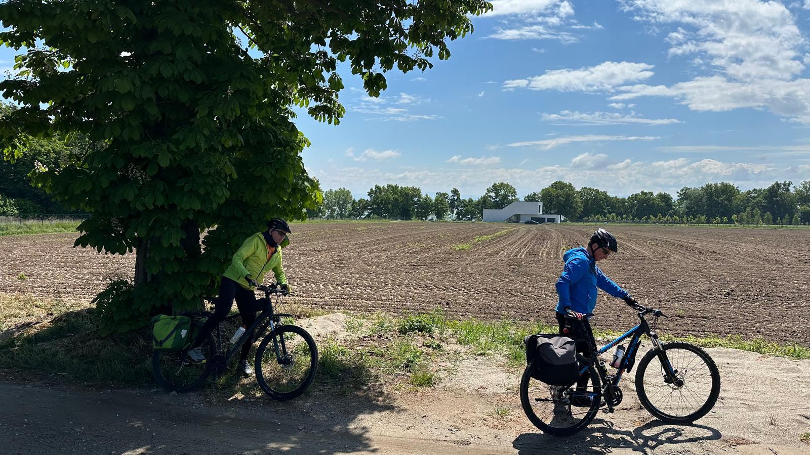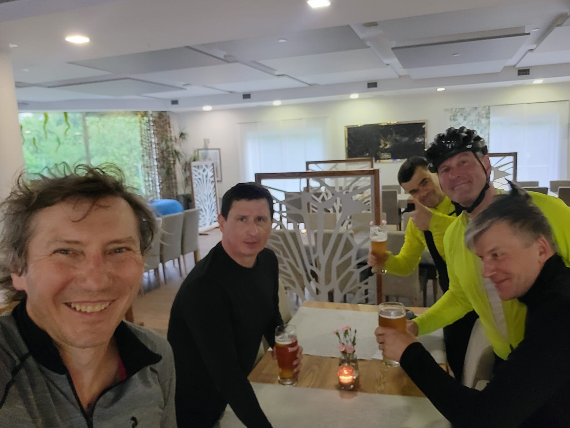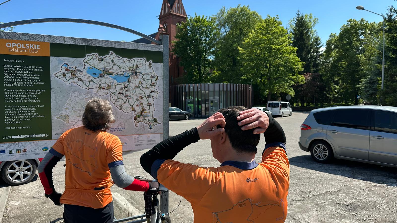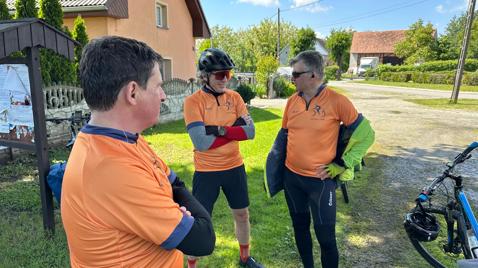 o szybkiej naprawie dętki (ale tej w rowerze, bo my sami już jak dętki...) ruszyliśmy dalej. Pierwszy raz od startu powitało nas piękne słońce i nawet w trakcie jazdy pozbywaliśmy się wierzchnich warstw niczym powabne pracownice klubów w Amsterdamie (tzn. tak nam koledzy opowiadali, że tak tam jest). Korzystając z bezsprzecznych zdolności nawigacyjnych Krzysztofa, prawie wcale nie jechaliśmy po asfalcie, co nie było planowane... No, ale możemy śmiało uznać, że odcinek szutrowy podczas tegorocznego touru zaliczyliśmy śpiewająco. Śpiewami żałobnymi, ale zawsze... Ta podniosła atmosfera doholowała nas aż do Kawałka Nieba, czyli sympatycznej kawiarenki parafialnej w Nysie, gdzie z sercem przyjęto strudzonych kolarzy. Odwiedziliśmy też Paczków, a w nim winnicę i Muzeum motoryzacji. Niestety, nie pamiętamy, które miejsce było lepsze, więc jak nie pamiętamy to obstawiamy winnicę... Dalej już było z górki, bo blisko do hotelu w miejscowości Bardo, ale sam hotel pod górkę i to taką o nachyleniu 20%... Więc nasze nogi płoną! Tak jak i serca do dalszych etapów!